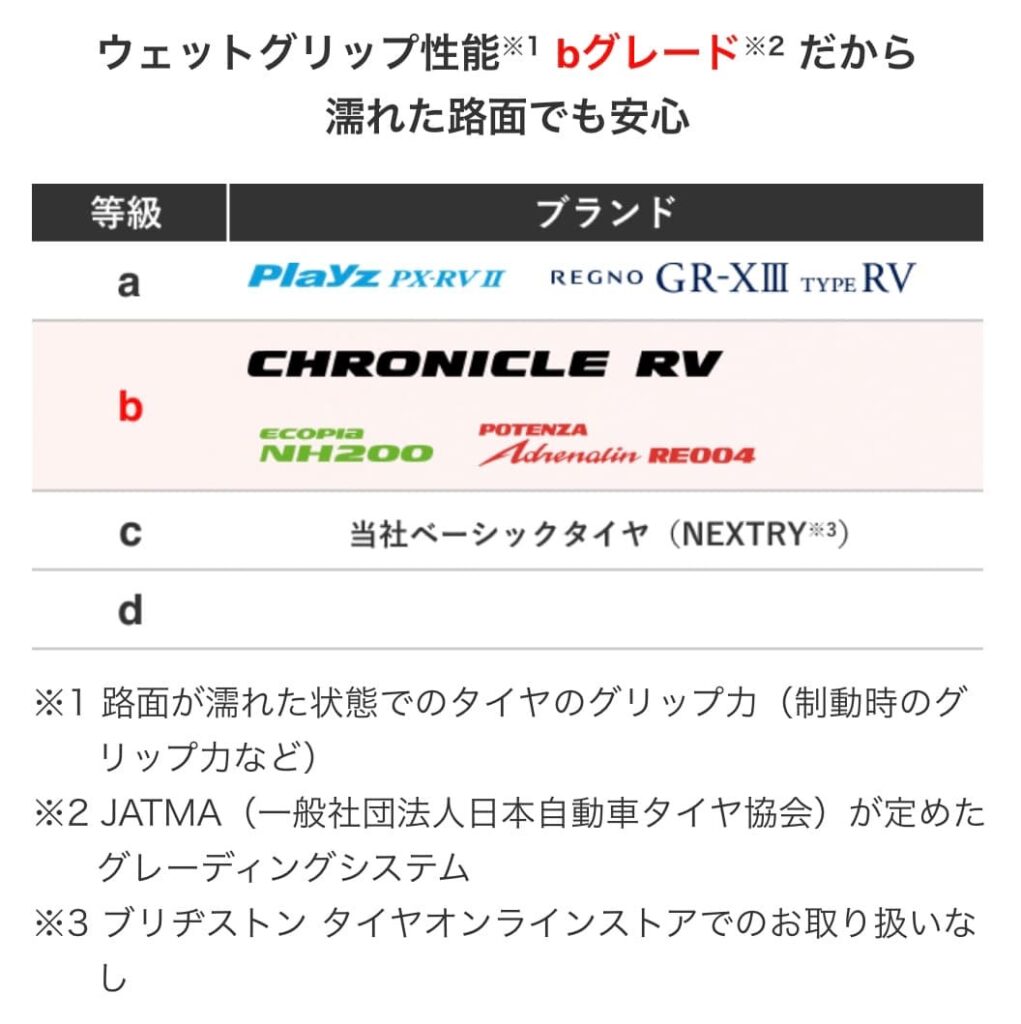 クロニクルは、ウェットグリップ性能「b」グレードを取得しており、雨の日でもしっかりと止まれる安心感を備えています。